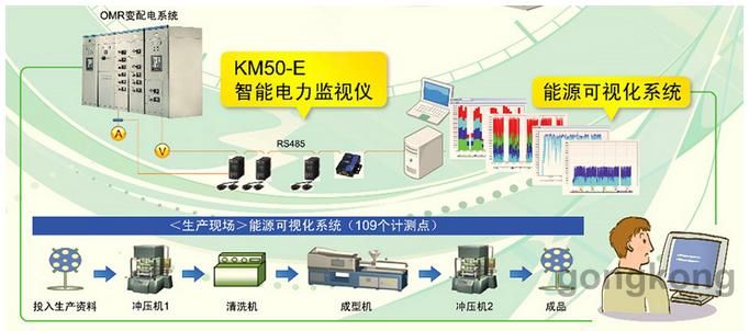 為了對工廠的生產(chǎn)和動力用電進(jìn)行更好地監(jiān)視,以便于管理用電以達(dá)到有效用電和節(jié)能的目的,我們在新OMR工廠對生產(chǎn)和動力用電共計109個計測點安裝了智能電力監(jiān)視儀KM50-E.