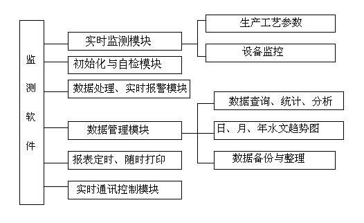為了將系統(tǒng)集成為具有測量、控制、管理功能于一體的測控系統(tǒng),在車間級(jí)的Intranet中集成了生產(chǎn)在線數(shù)據(jù)庫以及控制參數(shù)與工藝數(shù)據(jù)庫服務(wù)器,生產(chǎn)在線數(shù)據(jù)庫服務(wù)器主要用于管理當(dāng)日當(dāng)班的人員、計(jì)劃調(diào)度以及生產(chǎn)完成情況,工藝數(shù)據(jù)庫服務(wù)器主要用于記錄生產(chǎn)工藝參數(shù)、重要工段以及重要設(shè)備的定時(shí)抽檢數(shù)據(jù)、故障幾率等,便于了生產(chǎn)管理。整個(gè)程序的設(shè)計(jì)功能如下: