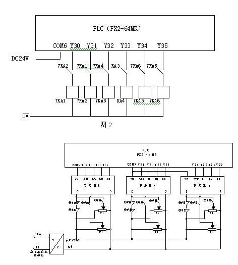 變頻器1﹑2﹑3分別控制電機(jī)M13﹑M14﹑M15,主回路接線圖略。PLC為FX2-64MR。FMA﹑11是來自灌裝機(jī)變頻器0~10V的輸出信號(hào),經(jīng)過信號(hào)隔離器的轉(zhuǎn)換作為變頻器1﹑2﹑3的控制信號(hào)。圖中KA1-6為輔助繼電器。W1-6為分壓電位器。PLC的輸入端子略。FMA﹑11是來自灌裝機(jī)主機(jī)變頻器的輸出信號(hào)。兩圖中的PLC為同一PLC,圖2中的COM6接DC24V電壓,控制輔助繼電器。