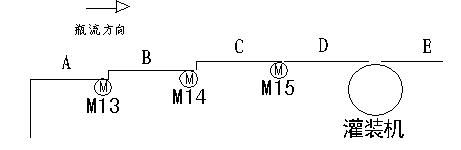 根據(jù)工藝要求,灌裝機(jī)前面的輸送帶分成若干段。A﹑B﹑C﹑D﹑E為輸送帶,M13﹑M14﹑M15分別為A﹑B﹑C帶的拖動(dòng)電機(jī)。D帶與灌裝機(jī)機(jī)械聯(lián)動(dòng),E帶由另一電機(jī)拖動(dòng)。另外,各帶上均有光電傳感器探測(cè)瓶流速度。PLC根據(jù)瓶流調(diào)整各段輸送帶的速度。