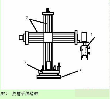 機械手結構如下圖1所示,有氣控機械手(1)、XY軸絲杠組(2)、轉盤機構(3)、旋轉基座(4)等組成。