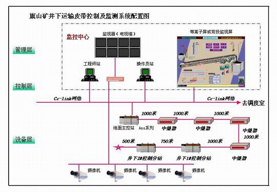 系統為實時監控網絡結構,具備有完善的生產監控管理功能,對皮帶運輸主要環節及相關的輔助環節的生產過程進行實時數據采集、傳輸、處理、顯示、記錄打印,對井下運輸皮帶系統進行遠程集中監控,同時配合工業電視系統進行安全圖像監視,以確保人員及設備的安全。