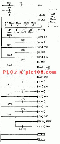 按下起動按鈕SB1,輸入點0000為ON,則作為互鎖條件的輔助繼電器1000為ON,互鎖指令IL接通,IL與ILC之間的線圈正常工作,“全部輸出禁止”解除。若(抓圖1)常閉觸點都為ON,保持繼電器HR000接通,輸出點0503使上升電磁閥得電,手臂上升。當手臂上升到位時,上升限位開關使輸入點0005閉合,保持繼電器HR001 接通,HR000復位,輸出點0501使左轉電磁閥得電,手臂左轉。......以后每當一步動作到位,限位條件滿足時,狀態轉移,進行下一工步動作。當狀態轉移到HR008為ON時,輸出點0506使放松電磁閥得電,機械手放松,同時定時器TIM00計時。當計時2秒到,狀態又轉移到HR000,程序又重新從第一工步開始循環。