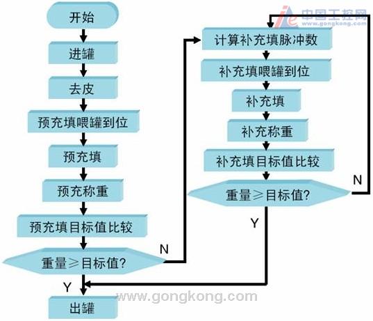 全自動粉末罐裝機的工藝核心在于兩次充填:預充填和補充填全自動 經過去皮的空罐由喂罐系統送至到預充填下方進行預充填,預充填的量事先在PLC中設定好,由伺服電機根據PLC的脈沖指令帶動充填螺桿進行充填粉末罐裝機 預充填完成后再由喂罐系統將罐送至預充稱重的工位,由稱重傳感器稱重(一般在預充填時會留出目標重量的1%-5%左右的空間給補充填),將稱重的實際值反饋給PLC,由PLC運算(補充填量=目標重量-預充填稱重實際值)給出需要補充填的量,喂罐系統將罐送至補充填位開始補充填粉末罐裝機 補充填完成后由喂罐系統送至補充填稱重傳感器上進行檢測,如果重量合格則完成充填出罐;如果離目標值差距較大則再由喂罐系統送至補充填進行二次補充填,直到重量合格為止完成充填出罐粉末罐裝機