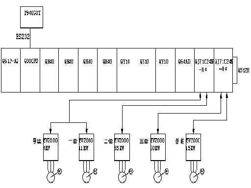 如圖,系統(tǒng)采用三菱公司的Q系列PLC作為主控制器,傳動控制為艾默生公司的EV2000系列變頻器,人機界面為F940GOT。