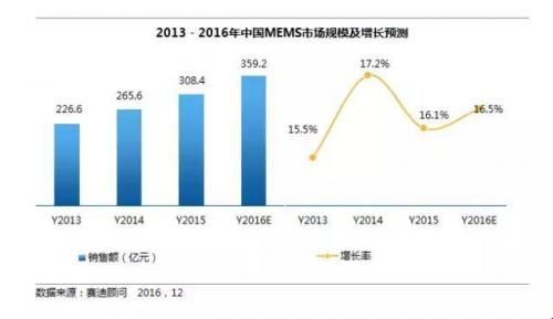中國智能手機、平板電腦、可穿戴設(shè)備等MEMS應(yīng)用整機產(chǎn)品產(chǎn)量保持穩(wěn)定增長物聯(lián)網(wǎng) 帶動加速傳感器、陀螺儀、硅麥克風(fēng)等產(chǎn)品需求的增長。與此同時MEMS市場,上述整機產(chǎn)品中MEMS市場,加速度傳感器、陀螺儀、硅麥克風(fēng)等的滲透率進一步提高對MEMS市場規(guī)模的擴大也起到重要作用。另外MEMS市場,中國汽車工業(yè)的增長也推動了壓力傳感器、微機械陀螺儀等MEMS主力產(chǎn)品市場的增長。隨著國際消費市場的回升,以及市場基數(shù)的增大,中國MEMS市場增速將保持穩(wěn)定。預(yù)計2016年,中國MEMS市場銷售額預(yù)計將達359.2億元。