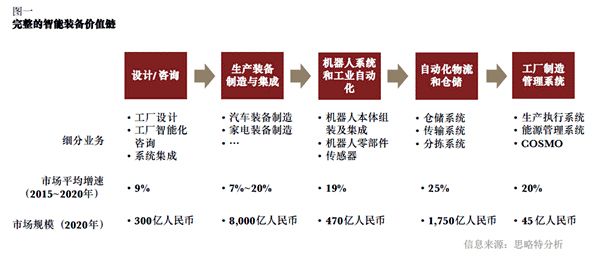 根據(jù)思略特公司近期的研究,我們預(yù)計到2020年中國智能設(shè)備整體市場規(guī)模將突破一萬億元人民幣,其中規(guī)模最大的生產(chǎn)設(shè)備制造與集成業(yè)務(wù)將擁有8000億元的市場潛力,而增速最快的領(lǐng)域是自動化物流和倉儲,以及工廠制造管理系統(tǒng),這兩個細(xì)分市場在2015至2020年的年復(fù)合增長率分別將達(dá)到25%和20%(參見圖一)。