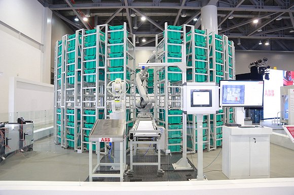 在本屆活動上,ABB也展出了關(guān)于物流倉儲的新型機器人——“小型機器人(IRB1200)+大型機器人(IRB6700)”的組合應用。大機器人負責從上層傳送帶提取料箱,按照指令存入貨架相應位置,小機器人借助3D視覺輔助,拾取箱中物品并放置在下道工序的傳送帶上。